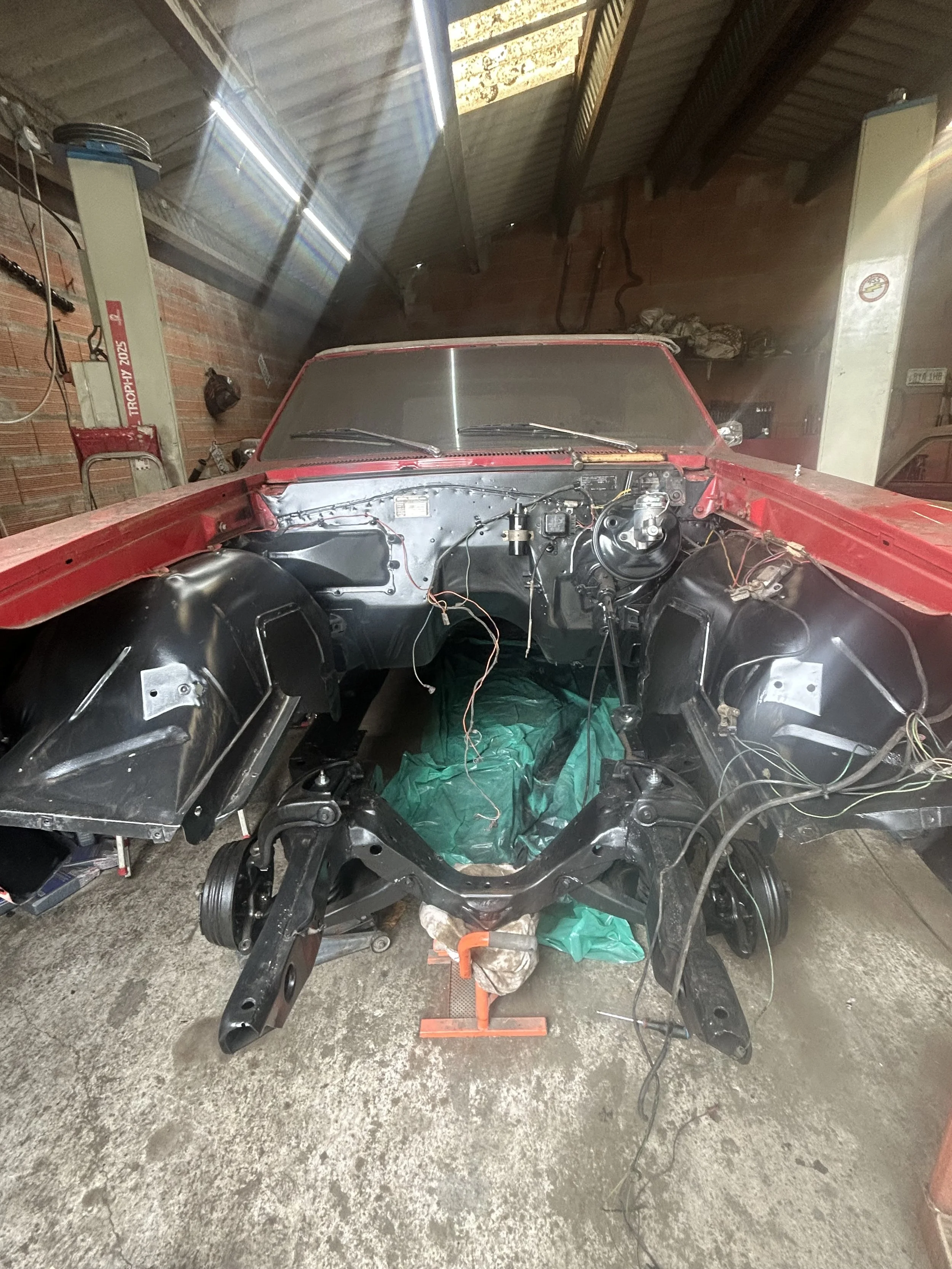Une fois la peinture terminée, l'ensemble moteur-boîte a été réinstallé dans la Pontiac avec précision, en prenant soin d’aligner correctement tous les points de fixation et de respecter les couples de serrage.