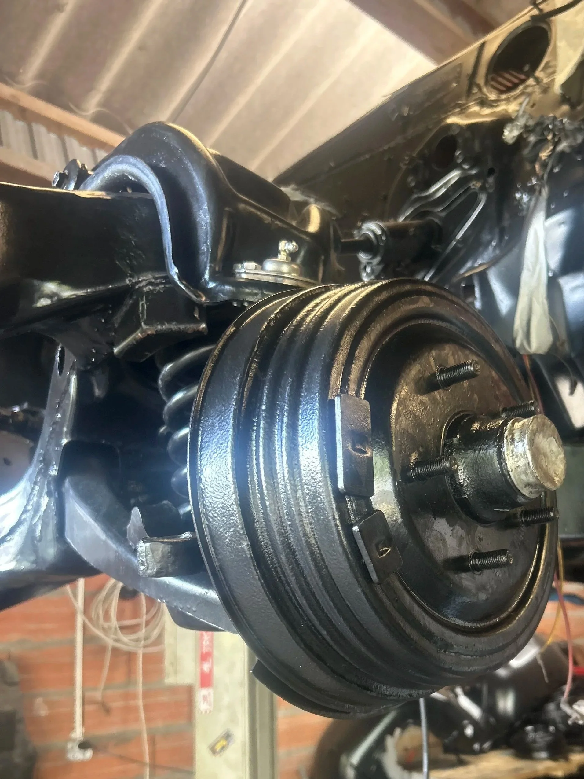 Les trains roulants ont été entièrement démontés afin de procéder à une restauration complète et durable. Chaque composant a été inspecté, puis les roulements, les éléments de freinage (disques, tambours, cylindres, flexibles, etc.) ainsi que la visserie ont été remplacés par des pièces neuves ou rénovées selon les besoins.